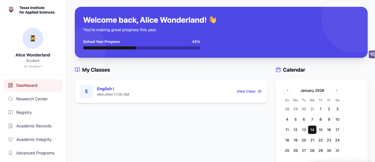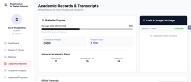 Students may view their completed courses, units granted, AAP and ASTP program status and performance, and view a preliminary version of their academic transcript.