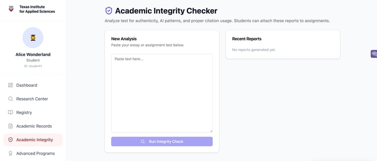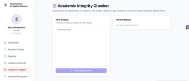 Students and teachers may use this feature to revise submissions for AI/Plagiarism and receive suggestions on how to improve their work, all revisions are processed using a complex Entropy and Logic Engine developed internally, all revisions generate a unique hash accesible to both teachers and students.