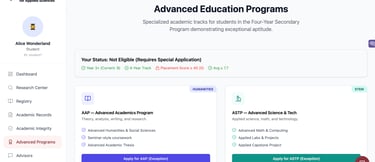 Students interested in applying to an Advanced Program may do so here. They may also manage their submissions, request guidance from advisors, review content and study materials and submit their Thesis.