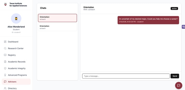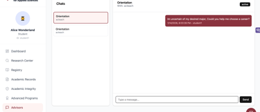 Students may request advice, orientation or any other form of assistance from their desired academic advisor from this page, a student may create up to 10 chats with different advisors.